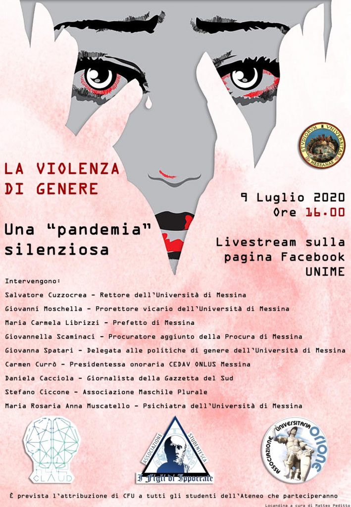 Giovedì 9 luglio, alle 16.00 in diretta sulla pagina Facebook Unime, si terrà un seminario sul tema “La violenza di genere: una “pandemia” silenziosa”, organizzato, con il patrocinio dell’Ateneo, dalle Associazioni studentesche Claud, I Figli di Ippocrate e Orione. Un tema delicato ma fondamentale da trattare, visto anche la tragica perdita di Lorena, la studentessa di medicina uccisa dal fidanzato.