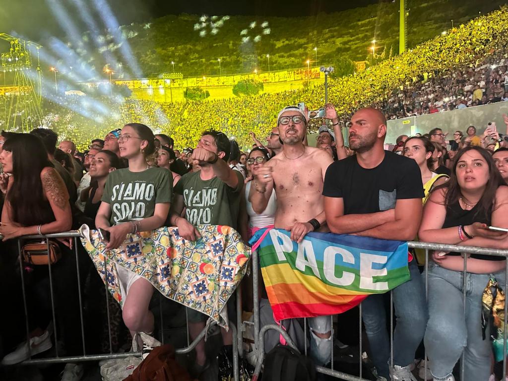 Con l’avvio del live, affidato a un classico come “Vita spericolata”, l’artista emiliano tiene a sottolineare: “Basta con la strage degli innocenti a Gaza. Basta con tutte le stragi di persone civili, di anziani, di donne, di bambini. Basta con queste guerre, le guerre dovrebbero essere proibite. La guerra non è mai giusta, le guerre sono tutte sbagliate, fanno male alla civiltà e alle persone comuni. Quelli che le dichiarano, che sono i farabutti che governano, poi non le combattono, perché loro stanno nascosti nei loro bunker e le fanno combattere ai giovani e massacrano i civili, la gente normale. Noi siamo per la pace, l’amore e la musica. Dove c’è musica non c’è guerra“.