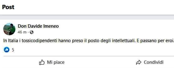 Tutto nasce con un post pubblicato da don Imeneo già alle prime ore del mattino di domenica 2 maggio sul suo profilo personale di Facebook: «In Italia i tossicodipendenti hanno preso il posto degli intellettuali. E passano per eroi».