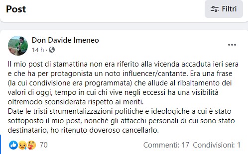 Don Davide Imeneo s’è ritrovato in un battibaleno con decine di commenti molto critici nei suoi confronti, sotto il suo post e in decine di condivisioni del suo messaggio, al punto da decidere di cancellare il post “della discordia” dalla propria bacheca.