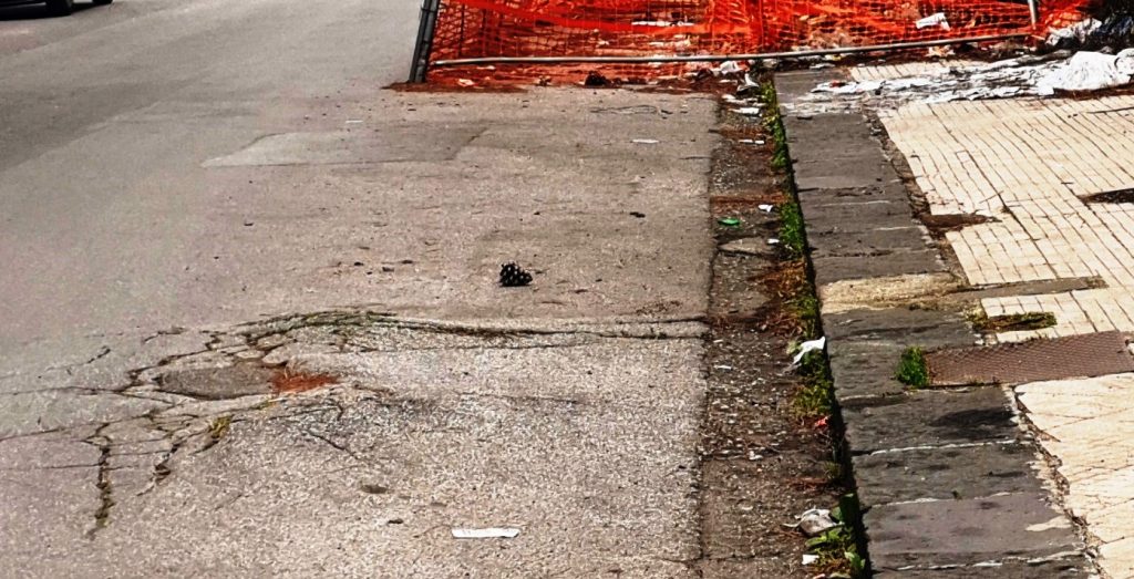 Una traballante e inadeguata (ormai piegata su sè stessa) recinzione di metallo, delimita materiali di ogni genere crollati sul marciapiede e su parte della carreggiata dal muraglione sovrastante. Al suo interno c’è di tutto: grossi rami secchi, terriccio, mattoni, immondizia. La struttura è “avvolta” da una rete di cantiere di colore arancione ormai staccatasi dai sostegni e finita, anch’essa, a fare inutilmente parte del contenuto del recinto stradale. Non segnala più, agli automobilisti, l’ostacolo posto sulla corsia in direzione Nord-Sud.