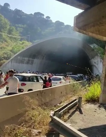 Fumo nella galleria Telegrafo A20. Automobilisti fuori dalle macchine