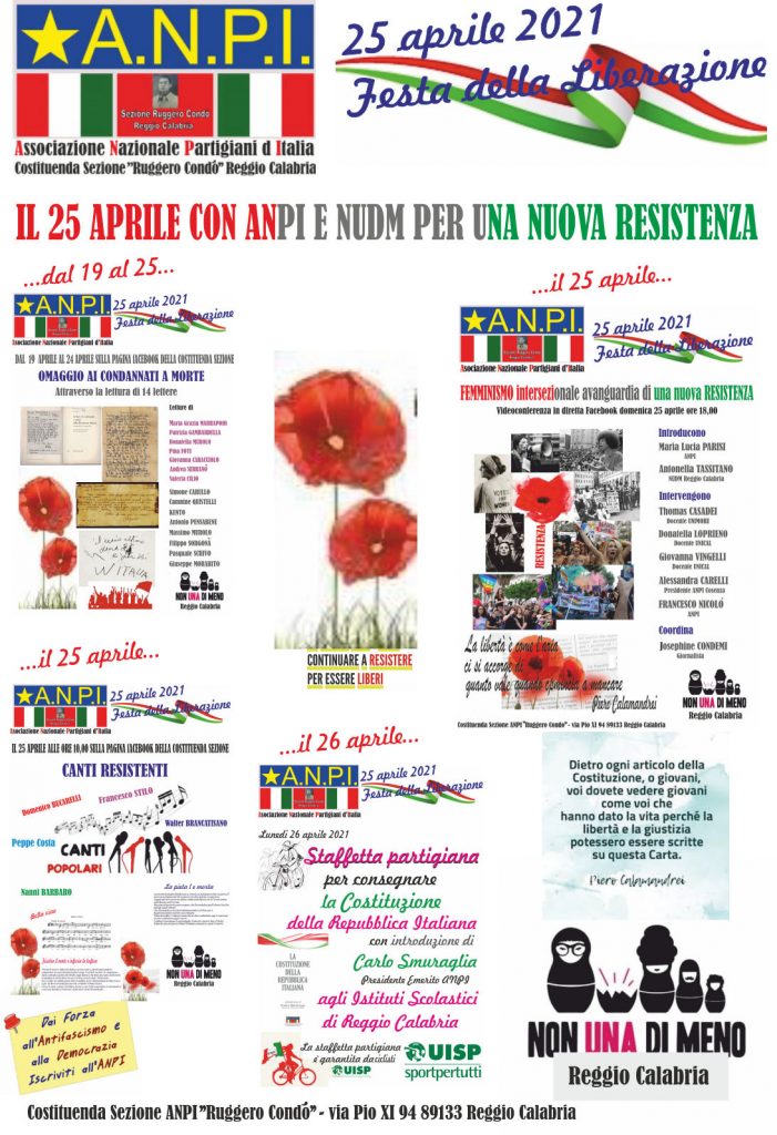 L’evocazione avverrà sulla pagina social dell’articolazione reggina dell’ Associazione Nazionale Partigiani Italiani sulla quale, due volte al giorno, dal 19 al 24 aprile, verranno pubblicati i relativi video.