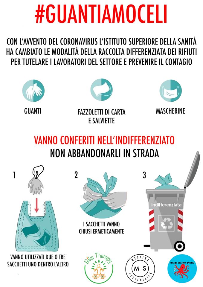 I volontari stanno distribuendo in bicicletta, ai negozianti, la direttiva del Ministero, con il fine di raggiungere più persone possibili per evitare il disastro ambientale nella nostra città e nel nostro mare, ed evitare il contagio da contatto, per un possibile non corretto smaltimento.