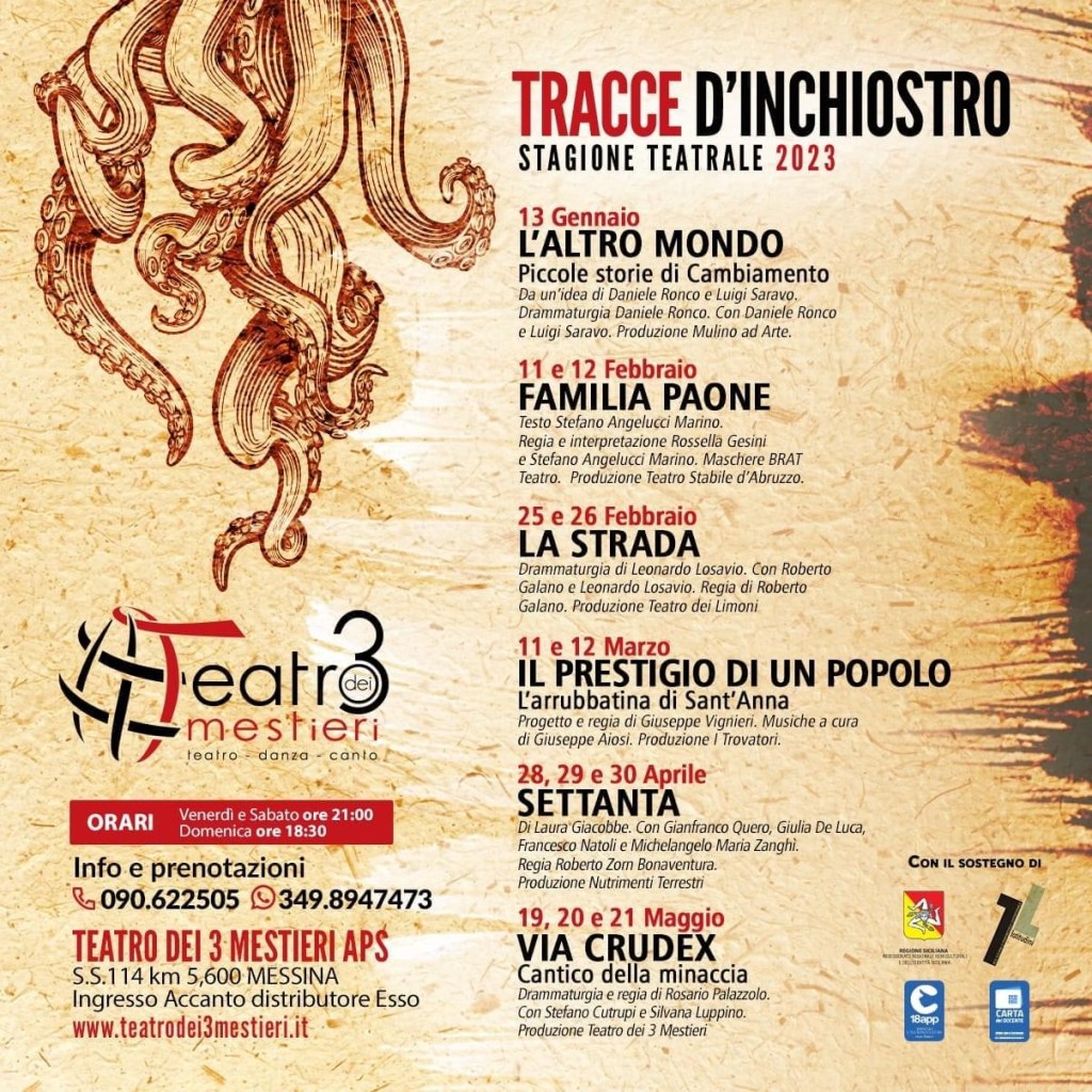 MESSINA – Tracce d’inchiostro è la nuova stagione del Teatro dei 3 Mestieri: 6 appuntamenti di drammaturgia contemporanea che ci accompagneranno dal 13 gennaio fino a maggio.