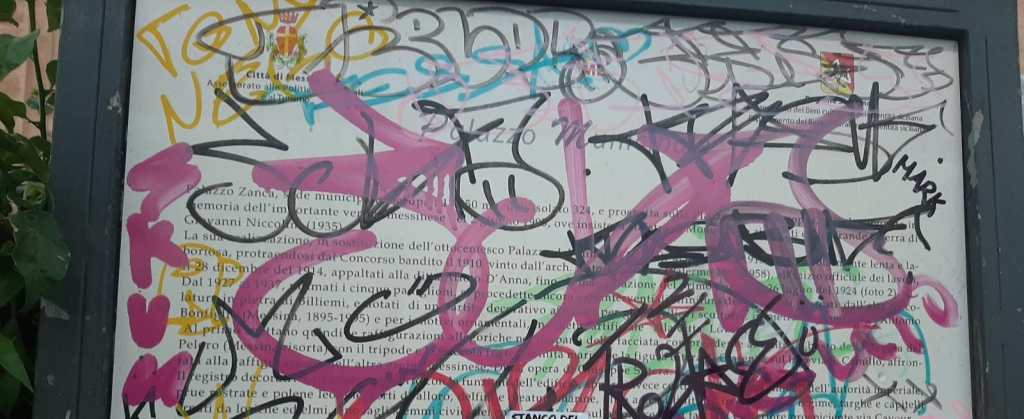 Da qui la scelta di tanti ragazzi di riempire di sigle le indicazioni per i turisti, cancellando la rievocazione di pezzi di storia messinese. Un gruppo collettivo e ognuno ha messo la propria firma, come fanno sui social.