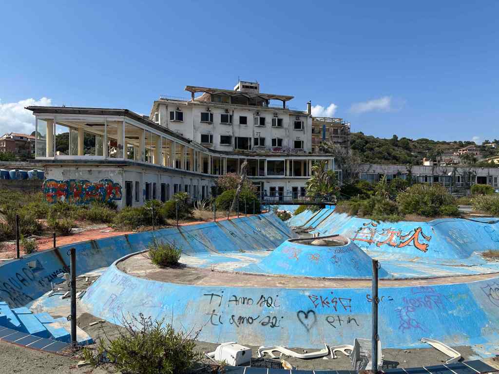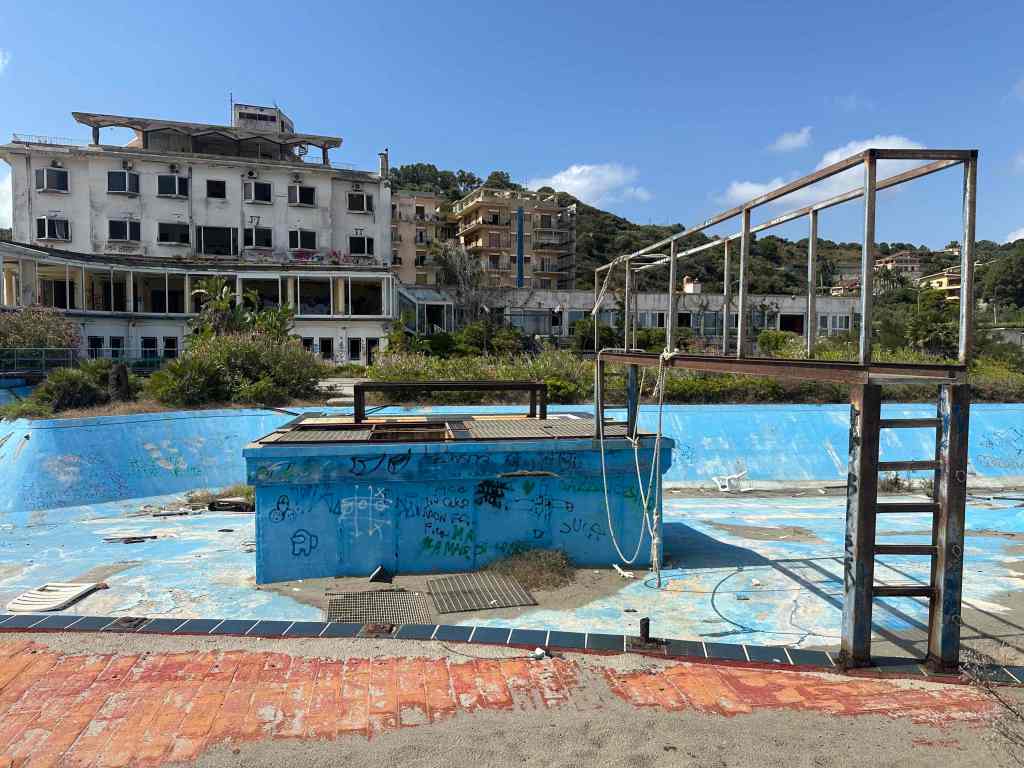 Dalla recinzione danneggiata ci si può facilmente “tuffare” nella grande piscina. Ecco quel che resta della struttura abbandonata