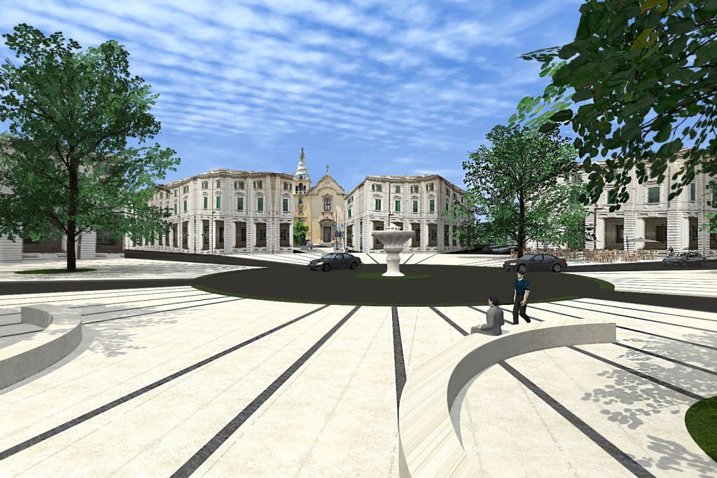 Ecco, in foto, il progetto che lo stesso comitato aveva presentato e che non è stato preso in considerazione. La loro visione, infatti, era completamente diversa da ciò che intravediamo oggi dalle reti arancioni. I progettisti avevano immaginato il transito delle auto nella croce, proprio quella che adesso si sta ripavimentando, e l’area pedonale negli spicchi che avrebbero collegato la piazza centrale ai portici. E poi dei collegamenti naturali con Largo Seggiola e con il sagrato della Chiesa dello Spirito Santo.