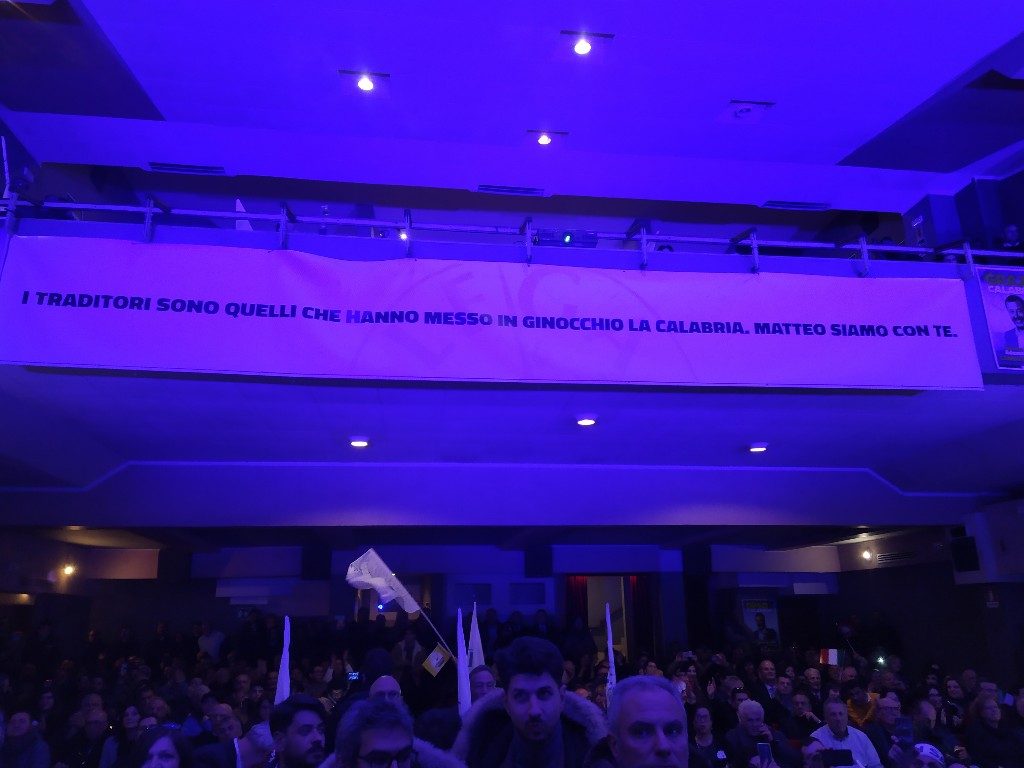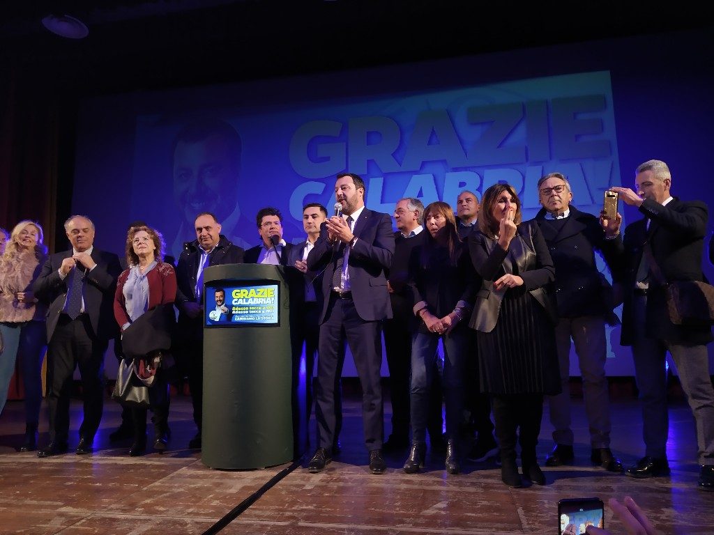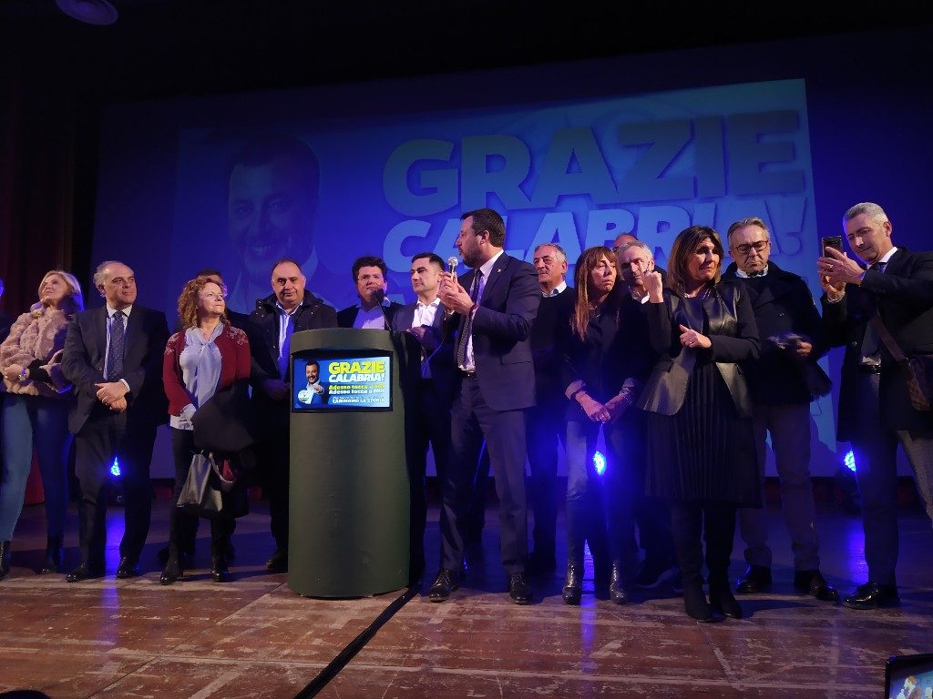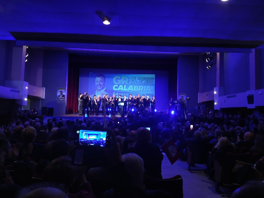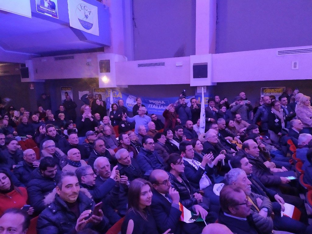 Reggio Calabria, 6 febbraio – Dopo la vittoria della colazione di centro destra, di cui la Lega faceva psrte, alle elezioni regionali, Matteo Salvini torna a Reggio Calabria per salutare e ringraziare gli elettori. L’incontro che si è tenuto al fine teatro “Odeon” è stato preceduto da una riunione con tutti i capigruppo e i consiglieri regionali. Il teatro ha fatto registrare il tutto esaurito, tantissimi gli striscioni e le bandiere. L’idea – Adesso ci prenderemo il comune e daremo alla città un sindaco all’altezza – queste le parole del senatore Salvini come proposito per i prossimi mesi. Per quanto riguarda il governo centrale il fulcro della campagna è il blocco di porti e lo stop all’immigrazione clandestina.