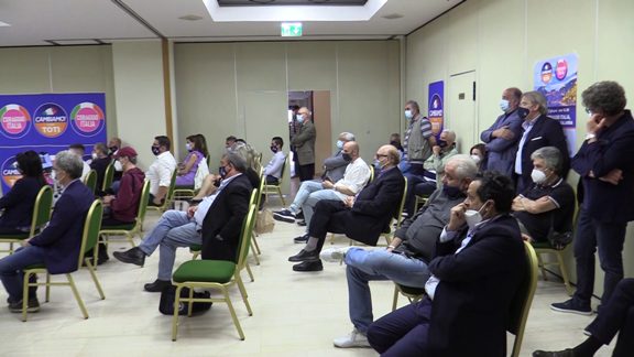 Al termine di un lungo “giro” calabrese, partecipato incontro reggino all’Hotel Excelsior per l’ex ministro alle Riforme. In sala i simboli sono due: appunto, sia quello di Cambiamo! sia quello di Coraggio Italia.