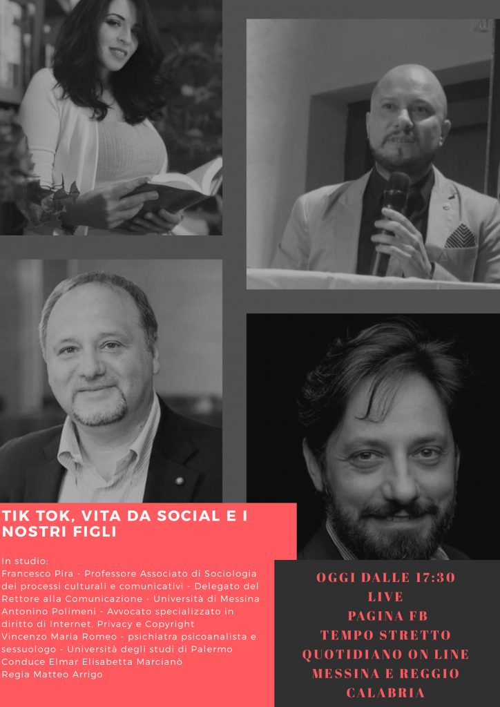 E allora sono arrivate le domande, molte. Le abbiamo fatte a tre esperti Francesco Pira – Professore Associato di Sociologia dei processi culturali e comunicativi – Università di Messina Delegato del Rettore alla Comunicazione – Coordinatore Didattico del Master in Social Media Manager – Svolge da anni attività di ricerca su bambini e adolescenti e nuove tecnologie. Antonino Polimeni – Avvocato specializzato in diritto di Internet, Privacy e Copyright. Vincenzo Maria Romeo psichiatra, psicoanalista e sessuologo. Università degli studi di Palermo